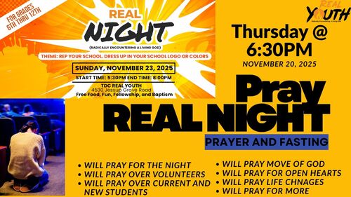 Come join us for a special prayer night on Thursday, November 20th at 6:30 PM as we come together in support and prayer for our first TDC youth Real Night event.