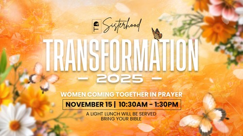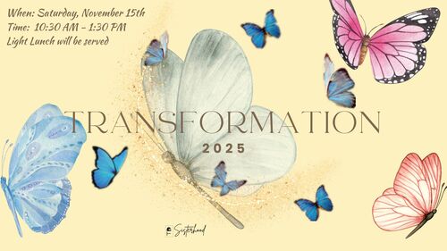Ladies, join us for our annual Transformation Event, Saturday, November 15th from 10:30AM - 1:30 PM. Bring your Bible, you will not want to miss this event. It has been called "a day at the spa". The spiritual spa that is. This is a time for prayer, contemplation and reflection, connecting with the Holy Spirit. Everyone walks away feeling refreshed and blessed.
